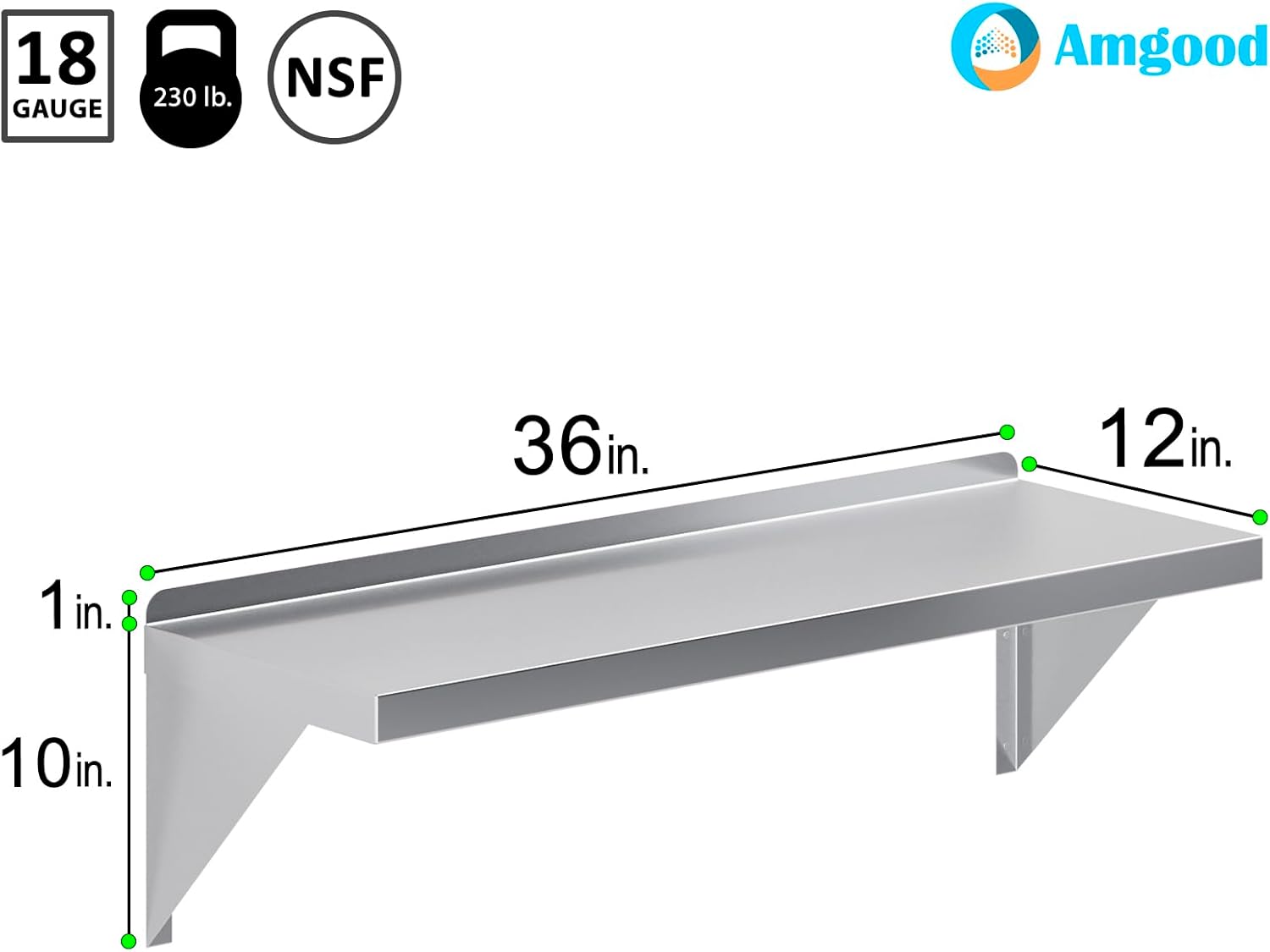 n. x 16 in. Stainless Steel Wall Shelf with 4 in. High Mounting Brackets and 1 in. backsplash. Squared edge. Enhance your organization and efficiency with the Amgood stainless steel wall mount shelf. Crafted with high-quality stainless steel, this shelf offers durability and sleek aesthetics for any space. Its sturdy construction ensures steadfast support for an array of items, spanning from spices and ingredients to small kitchen appliances and cleaning supplies.Product Specifications:18 Gauge 430 Stainless Steel Shelf 120 Lbs weight capacity1 in. backsplash2 Stainless Steel Shelf Mounting BracketsNSF CertifiedSturdy & Easy to SetupHeavy DutyCommon Applications:Shelf For Commercial KitchenAppliance Storage For Home KitchenUtility ShopGarage StorageLaundry Room StorageBathroomStove Top / Oven ShelfCloset SetupJanitors RoomButcher ShopEtc…NSF certified to meet the strictest standards for public health protection. The industrial-quality manufacturing process meets the highest regulatory requirements for construction, safety, and durability.