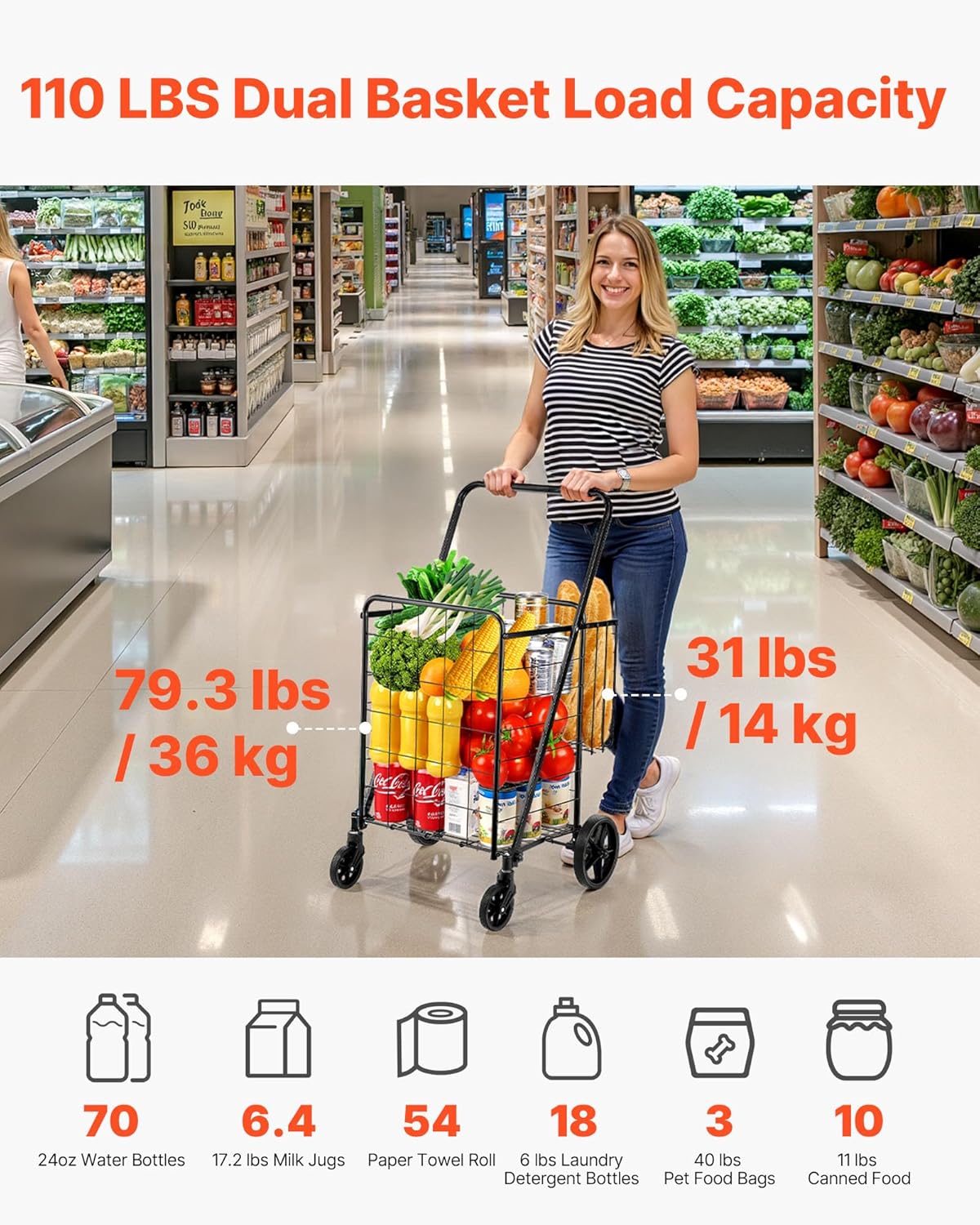 • Upgraded Intensive Mesh Base & Durable Frame: With a heavy-duty metal frame, the shopping cart boasts a heavy load-bearing capacity of 110 lbs, and the dense metal base wire construction can prevent items inside from falling off. Thanks to its powder coating surface, this shopping cart is anti-scratch and anti-rust.